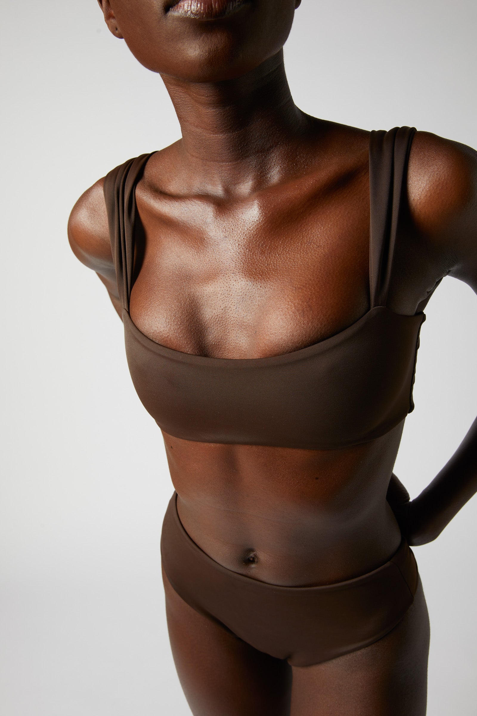 This swimsuit with a minimalist design represents BoGo's modern esthetic. It's brown fabric made from ECONYL® is a recycled polyamide made from marine and landfill waste.